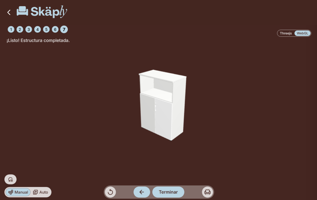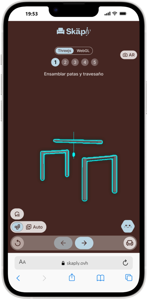 También hemos rediseñado el visor 3D donde se visualiza el proceso de montaje de los muebles. El nuevo diseño facilita el acceso a los controles para avanzar o retroceder entre pasos, haciendo la experiencia más intuitiva y cómoda para el usuario. Además, el diseño está especialmente optimizado para móviles, ya que sabemos que es el dispositivo que todo el mundo tiene a mano a la hora de montar un mueble, pero es usable en todos los anchos de pantalla.