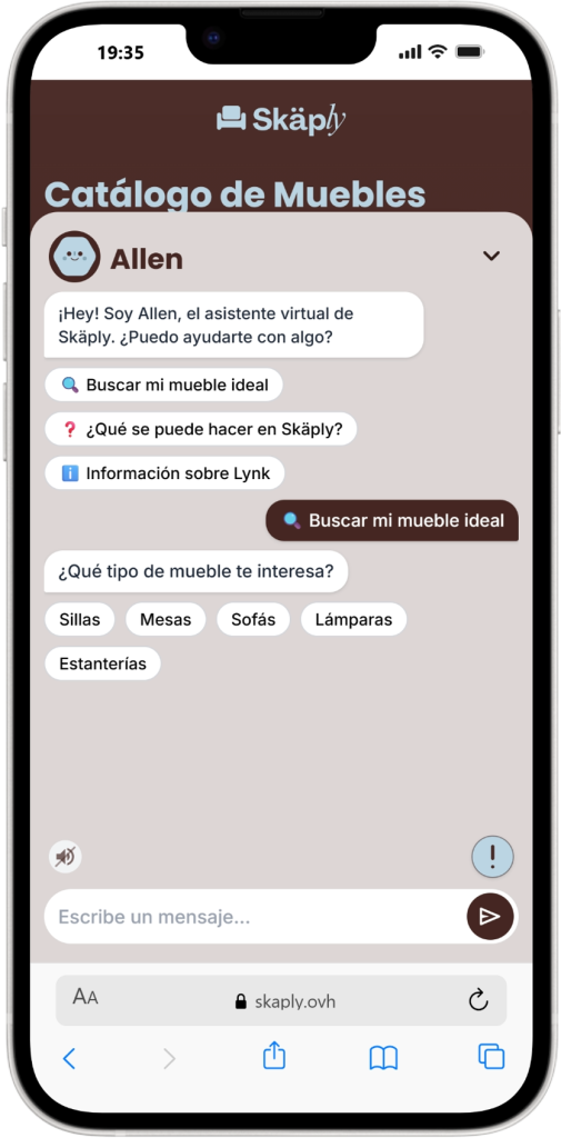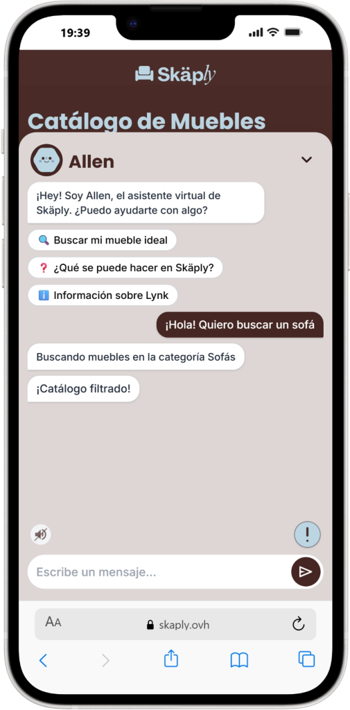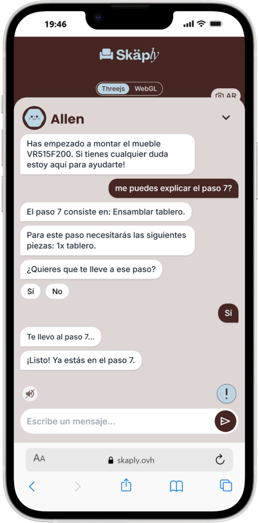 Hemos implementado nuevas funcionalidades en el chatbot. Ahora Allen, nuestro asistente virtual, puede ayudarte a encontrar tu mueble ideal, cambiar entre los distintos pasos de montaje o filtrar el catálogo según tus necesidades.